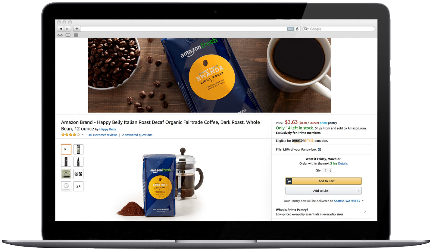 In the below step-by-step example, I updated the image by removing blemishes/creases/reflections in the bag, reducing coffee crumbs, and the oily film on the coffee. Then I updated the bag’s label and color to match the physical product.
